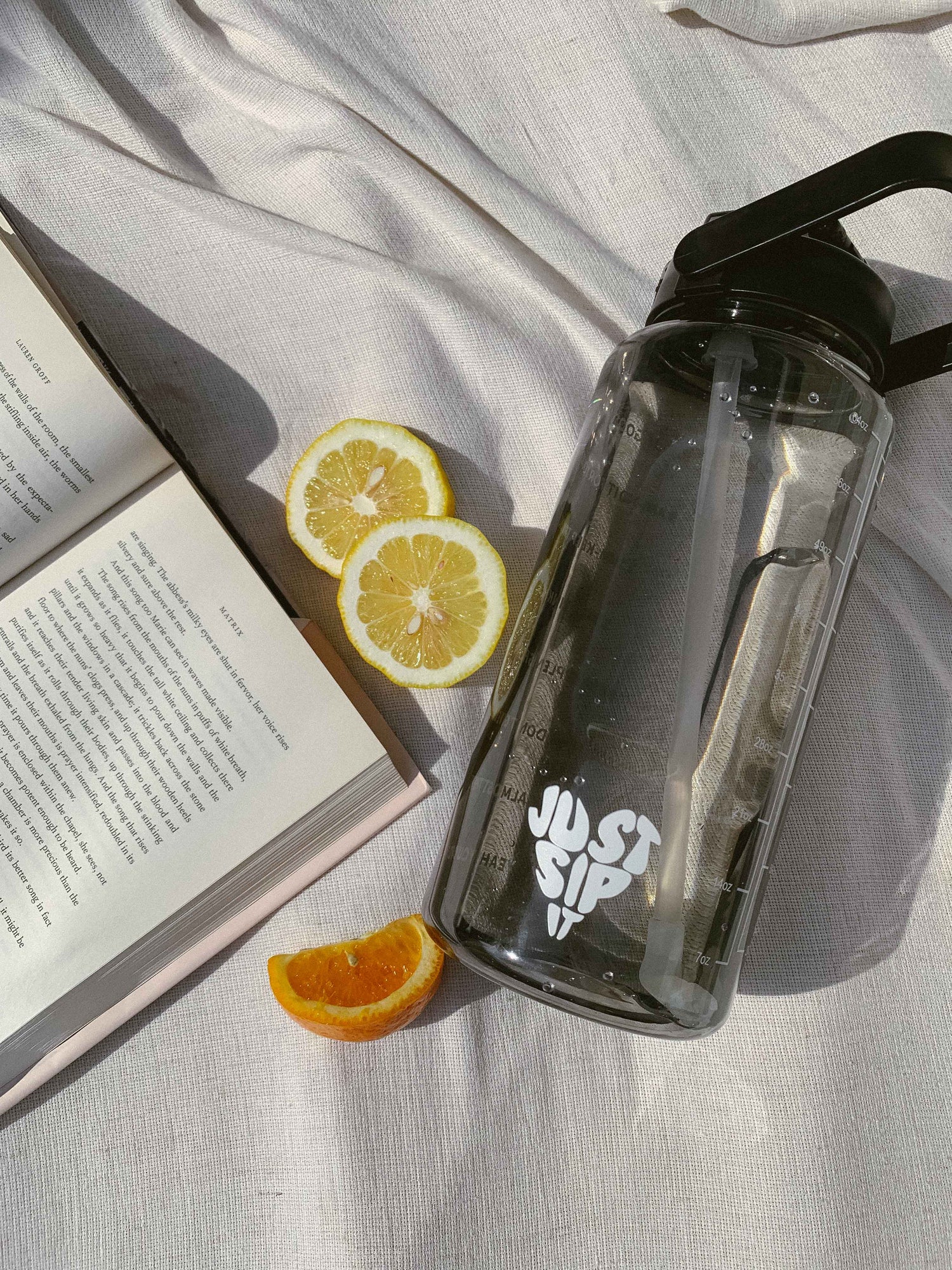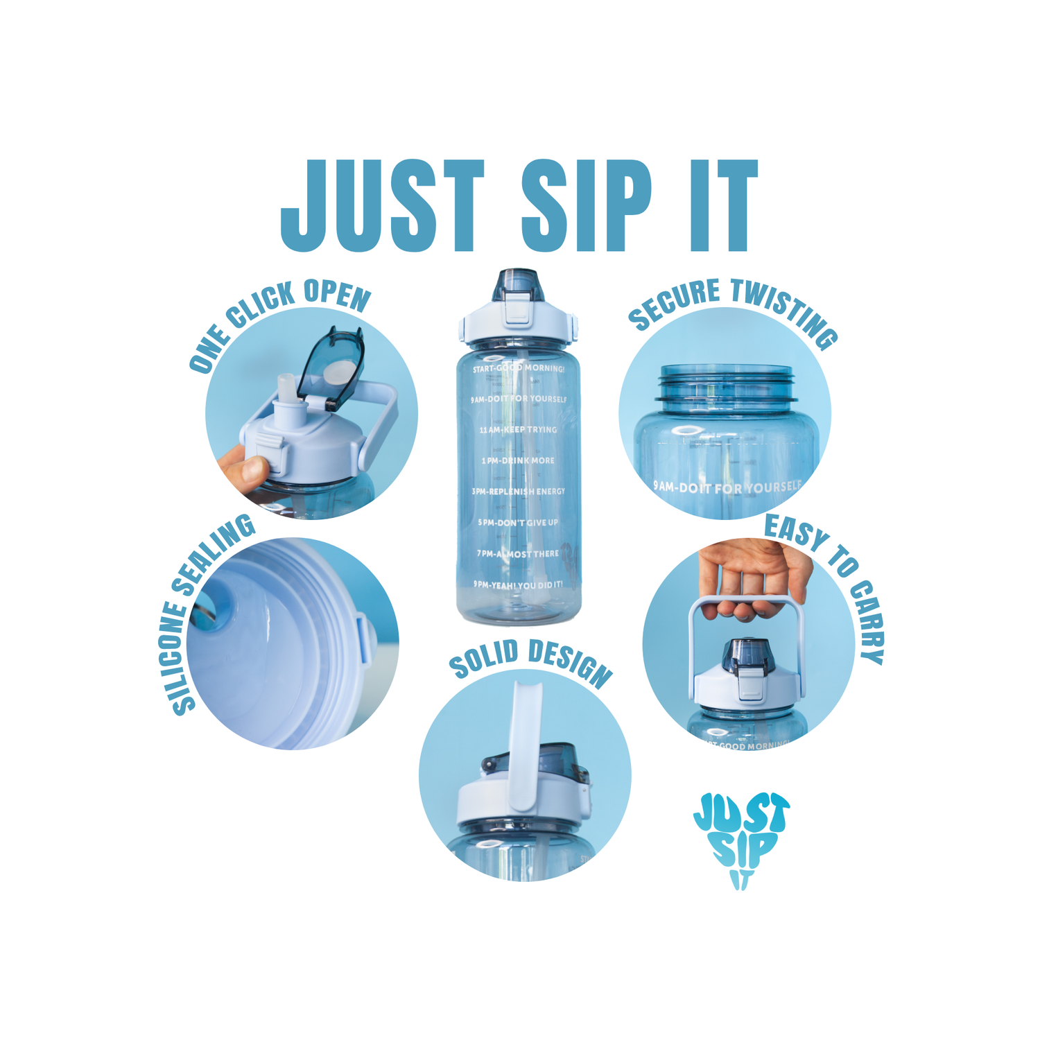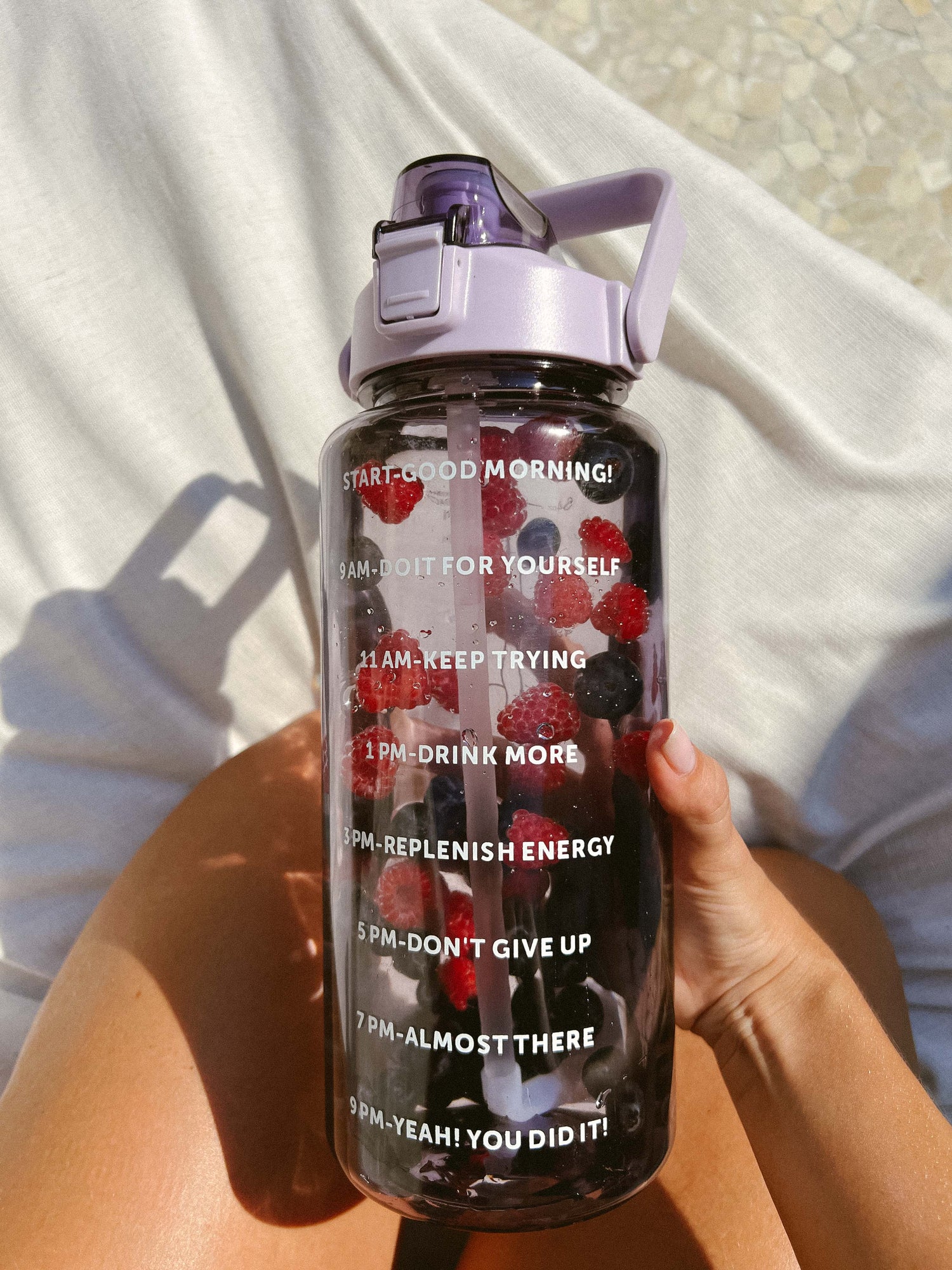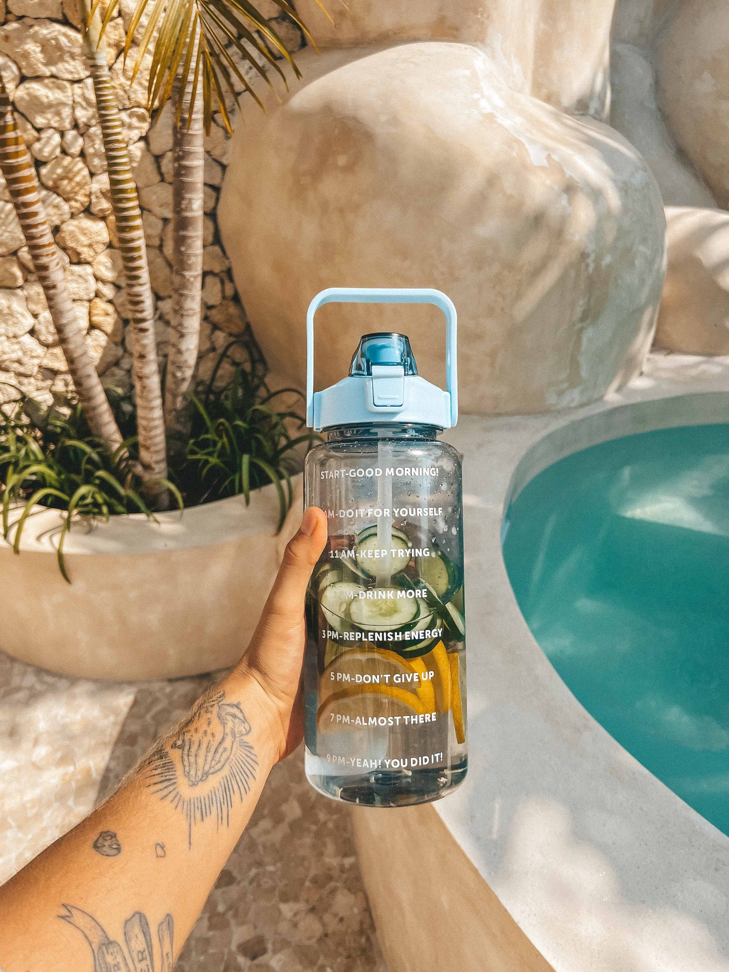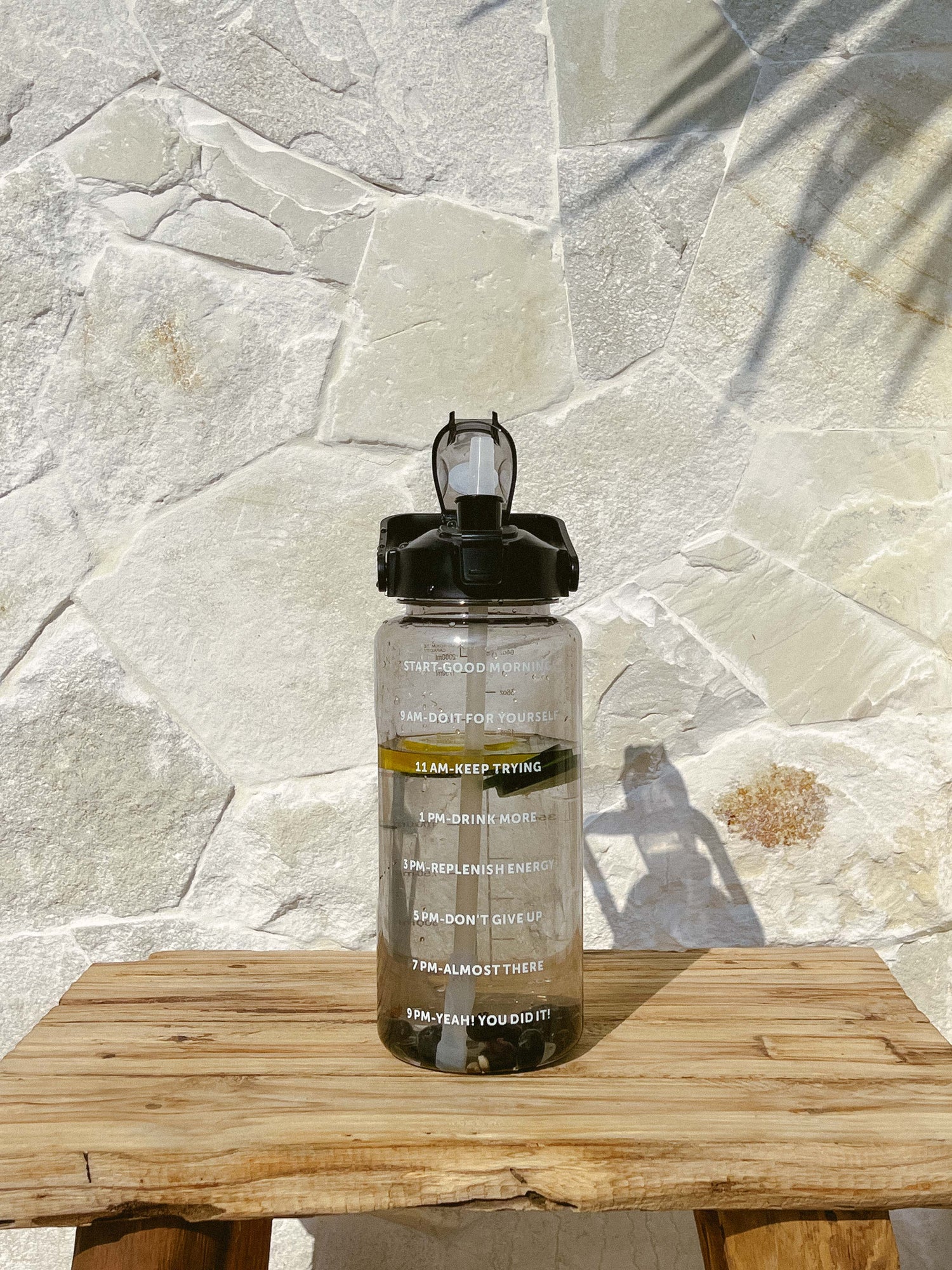 Water bottle with a straw, time markers, and motivational quotes to help you stay hydrated.